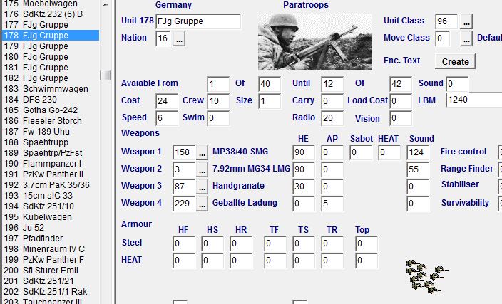 Attachment 15792 In the above picture I have seen a unit armed with a carbine. The maximum range of the weapon is 500 meters. The cost is 25. These guys I throw from a plane and with a little luck they land next to an enemy unit. All good, they're doing their thing.:up: Attachment 15793 And there is another group of FJg's. Apart from that the guy on the photograph looks like he's thinking of his girl, this unit has a submachine gun instead of the 98k and costs 24 points. The maximum Range of the smg is 150 meters. (They also have different MG's but that does not bother me with my thoughts now.) Normally, I would prefer the unit which is a bit more expensive so I do not have to think about it. But in this case, I think it would be better to land next to an enemy with a submachine gun in hand, rather than a carbine and therefore, although a comparison of the pure data would allow a different resume, I'd prefer the paratroopers with MP38/40. And because of all these, I thought to myself: Hey (Yoh), why do not you just delete all the units you do not understand and then you just have two different paratroopers during your second world war? One with bazooka for later and once with any predecessor of the bazooka for beginning of war. Both times with submachine guns. A good stroke of genius mhm? In the pictures you can see also why I was wondering that some units are underlined and the others are not. Thanks for the explanation @Andy. |