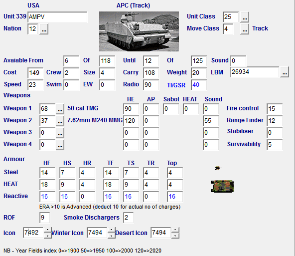 Now open up your target OOB, go to the weapons tab and find a free weapon slot (if there is one - if not, you are stuffed). Paste the weapon you just copied into that slot. Save weapon data before moving off. Now open your modified APC in the units tab, find the cannon (probably slot 1) and change its ID to the slot number you used to paste the copied data into. Change ammo to suit. Save OOB and exit Mobhack. Job done (though you should run the points calculator on the resulting OOB). |