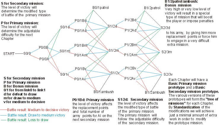 The player at the beggining of each Chapter he will gain some replacement points according to the level of adjustable difficulty (d, m, v). Then he will procceed to the Secondary mission (Sd, Sm, Sv) and by the outcome of his victory(?) he will procceed to the corresponding type of primary mission (Pd, Pm, Pv). The result of the primary mission will determine the new difficulty level (of the player) for the next Chapter.