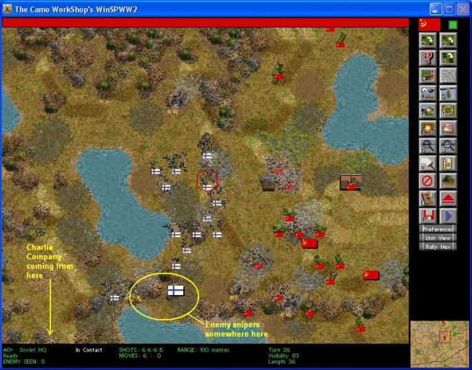 Charlie Company is starting to move out. I found the answer to why their "sniper" ripped up one squad earlier. There are two snipers. I haven't found them, but they are somewhere between the two lakes in this area. One of my squads had five men go down. There are two accepted ways to deal with snipers: Artillery and tanks. It is too risky to send tanks out and my mortars are busy. I guess I just have to deal with the incoming sniping.