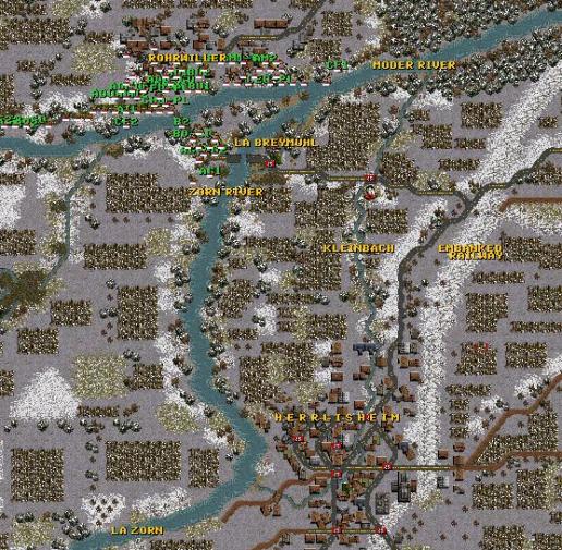 Now I could send them all south and cross the Zorn at the land bridge but the scenario is not long enough for that and the units will be attacking from the south.