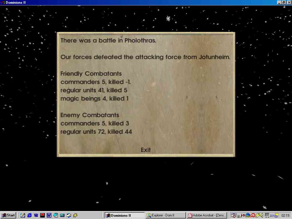 I am attaching the screenshot of the battle report, which shows "commanders killed: -1" -- never seen that before either.
