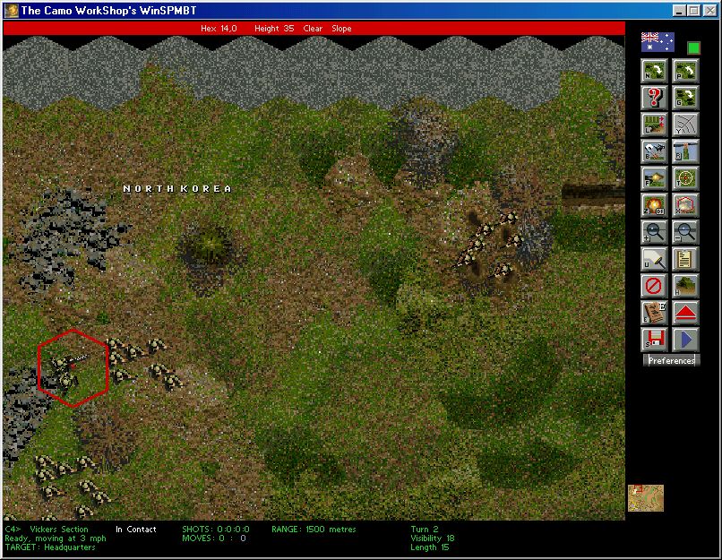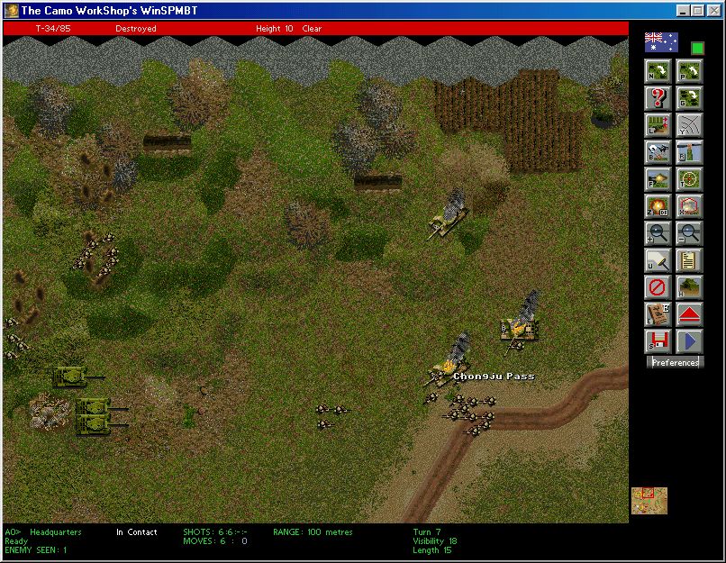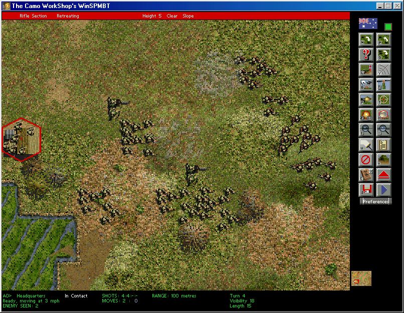 Attached screenshot shows southern Austrailian ground troops,along with the HQ. To the right the four enemy rifle sections ,including the three man retreating squad.