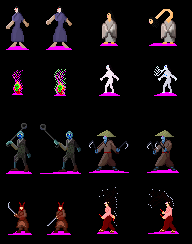 Hp 12 Size 2 Str 12 Att 12 Def 12 Prot 6 (1) Mor 12 Mov. 12/2 MR 12 Prec 10 Weapons: Kama, Kama (Dmg 3, Len 2). Armour: Monastery Robes (Prot 4), Wicker Hat (Prot 6). Undead, Pillage bonus (4), Ambidextrous (4). Gluttony (0).