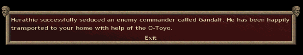 I was playing a game with Jomon Broken, using about 10 O-Toyos to cause all kinds of trouble in enemy territory and I got this message (attached). Seems Gandalf is a sucker for ladies that turn into a giant cat demons.