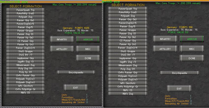 Another minor item is that the listing code looks at the unit class of unit 0 of each formation to decide where to place it on the purchase list - so an SP-AT platoon that gets a scout as unit 0 will display somewhere completely different from the pure SP-AT ones.