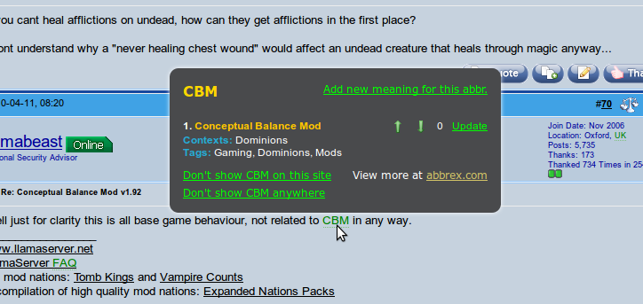 ABBREX's back-end abbreviation database is completely community-driven so even for obscure and very specific abbreviations like CBM, AN, SoAP, etc. as long as someone enters the meaning, everybody benefits from it when they visit the Shrapnel forums for example.