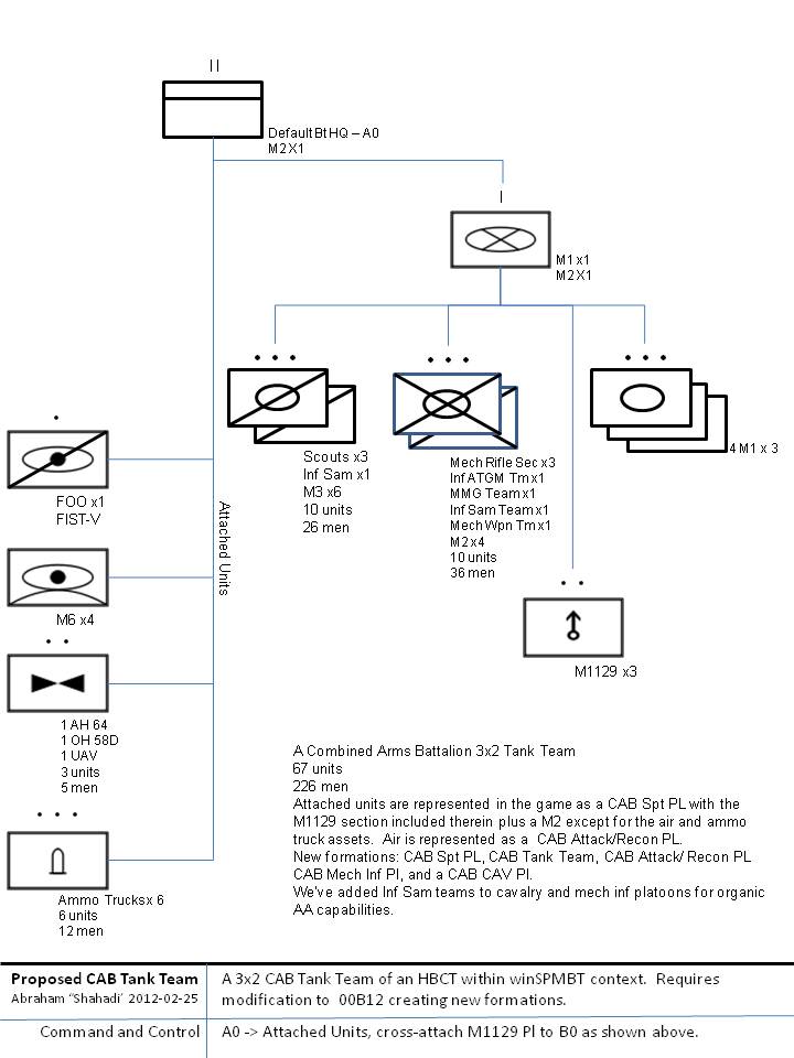 After consideration from fellow wargamers posting in this thread, I'm posting the Combined Arms Batalion (CAB) Tank Team. I've added a few formations to the OOB12 file in slots above 900. Check out the chart and let me know what you think. Notably, a Javelin team is attached to a Mech Inf and Cavalry Platoon. Additionally, I've created an Attack/Recon Helo Platoon composed of an AH-64 and an OH-58 helo. I believe Artillery will remain at Brigade, therefore, I did not include arty units.