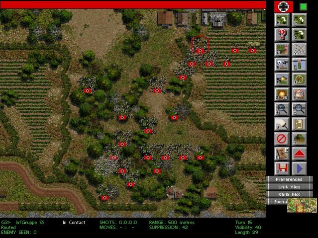From the bypassed village in the North, a Rifle sqd. opens fire on my right flank, causing some consternation. I pin them with my ACs and send the Sharpshooter around their flank. After he pops a few, they rout into the open and are eliminated. My center is temporarily stopped by a well-situated sqd. that covers their route of advance. I have to wait for the Mortars to take care of that. My left flank is only 200m from the 1st objective and encountering no resistance. Some 60mm Mortar fire hits the woods in my rear. I don´t know where that came from, and don´t really care. 19 turns to go.