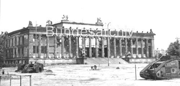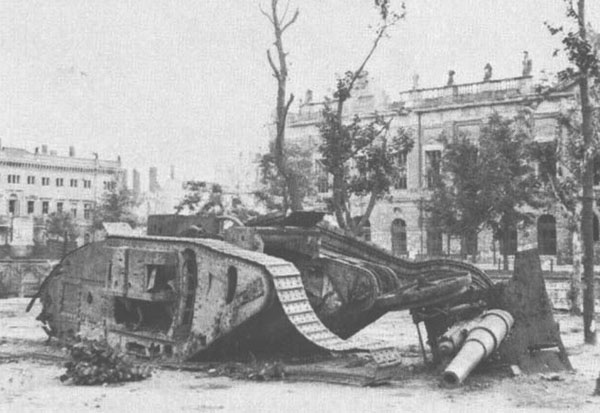 In 1945, Allied troops came across two badly damaged Mk V tanks in Berlin. Photographic evidence indicates that these were survivors of the Russian Civil War and had previously been displayed as a monument in Smolensk, Russia, before being brought to Berlin after the German invasion of the Soviet Union in 1941.[1] Accounts of their active involvement in the Battle of Berlin have not been verified.[2]