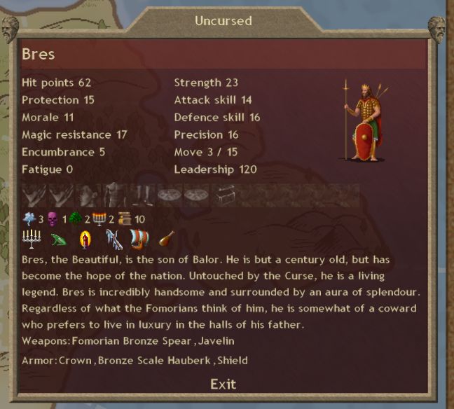 Fomorian: The cursed descendants of the giants, they are often marked by afflictions, and a goats head (two eyes), 30+ hit points. They are size four, so can only be placed one to a square- though can share space with the Fir Bolg. Recruiting the milita, you can expect at least 7 out of every 20 to be afflicted. You need to be especially cautious of battle fright. Basic protection of 5 is quite handy to have. Acceptably expensive. 20 strength, about, but 3 damage spears. Below average precision.
