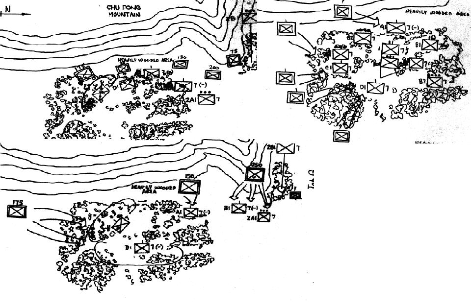 1210: final 2 plts A/1/7 arrive. PAVN units begin to arrive on battlefield. One plt B/1/7 chases PAVN and gets cut off by 2 companies of PAVN. Four pltns of PAVN move to south of LZ while 5 pltns attack the dry ravine opposite B/1/7.