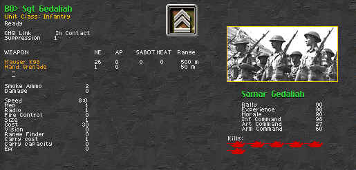 A couple of heroes emerge in this little firefight. One is Private Gahal who takes down three of the enemy. The other is Sgt.Gedaliah, who has up to now killed six of the enemy.
