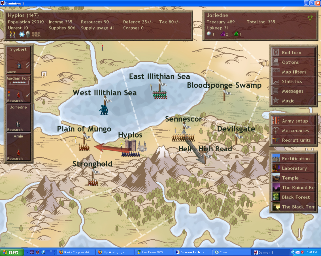 I got the mercenary. My scout is diseased, so Inkpot End must be in Sennescor. I have set taxes to auto, all my mages to research, and I sent all my toops (not including the mercenary) with Sigebert to take the Plain of Mungo. Tulka is indeed headed to "Hell's High Road."