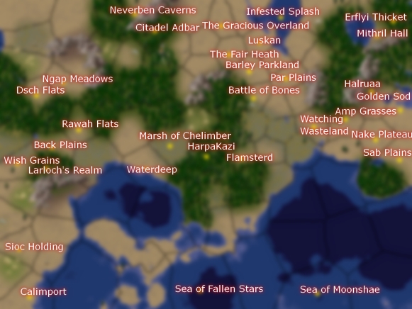 I have a base of around 90 province files built up, 50 of which are converts from Edi's Faerun map (with his permission), and a handful are exaggerated scripts just to show some of what is possible. So it needs more province files with original ideas and more name lists (there are over 30 now) to support a few terrains that I have not gotten to yet. Gandalf has already contributed some great name lists which are now included in the download. He has also been kind enough to donate server space for maintaining a library of province, data and set files.