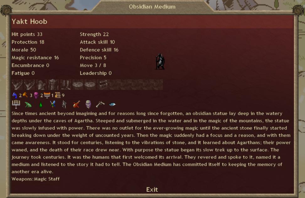 This mod creates two new heroes. Obsidian Medium is an ancient being of pure magic resting in a shell of obsidian. It's an E3W2D2 H1 mage available for both MA and LA Agartha. Agent of the Oracles is a rare human the Oracles of MA Agartha found interesting, giving their own twist into his magic. He is an E2F1D1 H2 mage with a researchbonus 5. His magic allows him to make Flaming Skulls, which all Golem Crafters can use to reach Phoenix Power, giving Agartha surprising firepower.