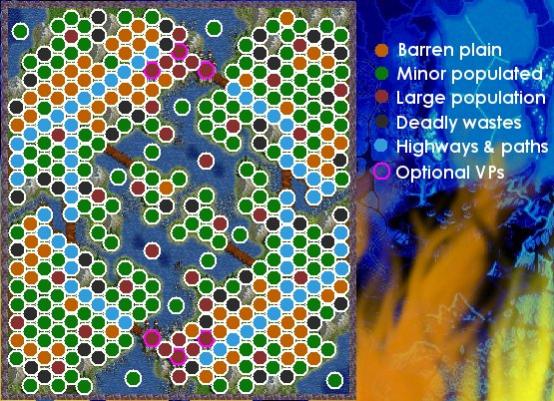 This map certainly won't be for everyone. It is the result of an experiment. I have only played a single game on it and found it entertaining, so thought I'd share it. It would have been even more entertaining if the custom battle maps had worked out as I had hoped. Since they did not, I stripped them out.