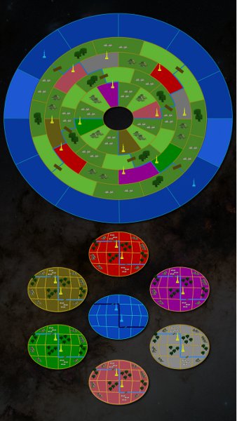 Each of the small colored discs contains 20 land provinces with the exception of the blue disc which contains 20 water provinces. All of the basic province details for each disc are identical and all but 6 of the provinces in each small disc can be a start location. Each smaller disc has bilateral symmetry with respect to an axis that follows the river.