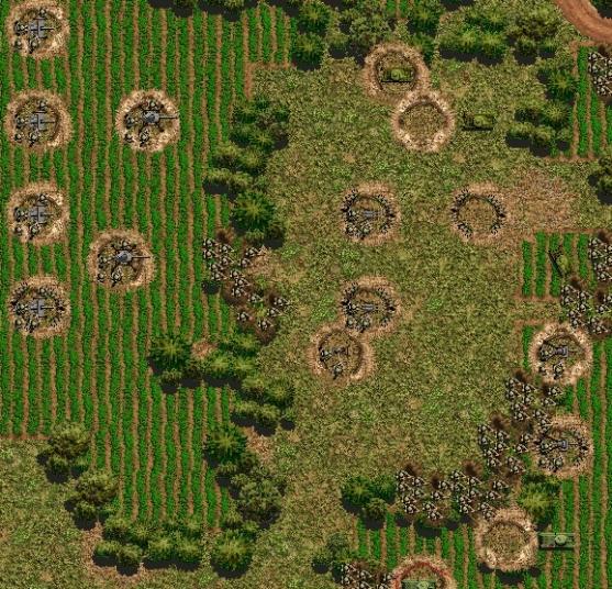 Here is a mini-mod that replace the original sandbag entrenchment graphics with new ones showing dug-in positions instead. Please see attached pictures for screenshot examples. There are four different types which appear randomly during assault/defend missions. The single file included in the zip goes into the Graphics folder which is found in the Game Data folder.