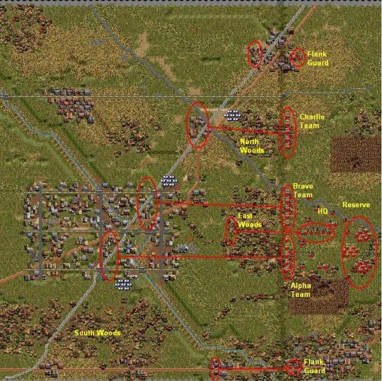 The plan is fairly simple. My three combined infantry-armor teams, still called Alpha, Bravo and Charlie will push forward to control two critical areas: the town and small village northeast of town.