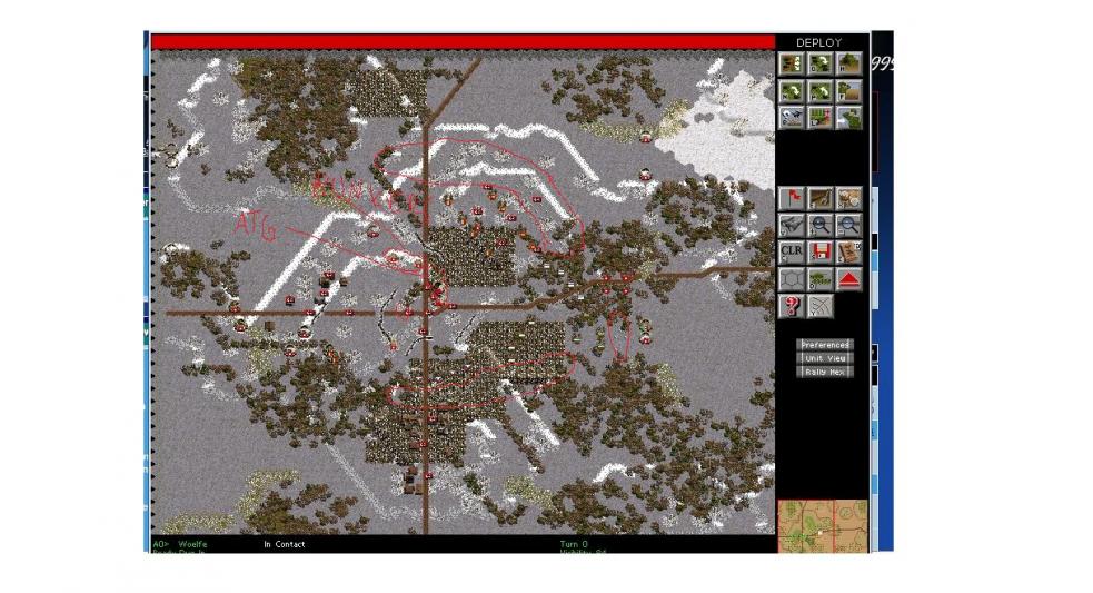 We deployed the most experienced of our troops in ambush positions near the road hopefully they can destroy a few tanks here. the northern hill is defended by 2 platoons of infantry. ifthe enemy tries to storm frontally he will run into the mines and heavy defense fire. The questionis if weretreat rapiddly from here or tryto hold. once under Fire it will be impossible to retreat.