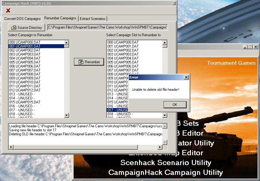 I searched for these terms, but no hits. I'm getting File Header Errors and Unable to Delete Errors when renumbering campaigns. I'm not sure what's going on. It started when I wanted to move the Sinai built-in campaign since the UN campaign from Wargamer wanted to occupy that slot, and I wanted to preserve both. The campaign wouldn't move and kept giving me File Header Errors. Strange. I left it alone overnight, tried again today and now it seems to have moved somewhat, but the old information in the Slot cannot be deleted. Am I missing something?