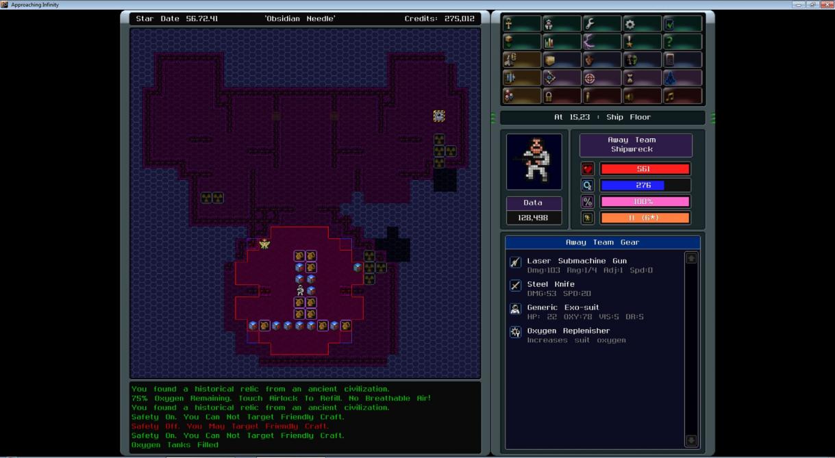 down in a merc base (injured/underequipped/outgunned) my way out of that level was cut of by 2 mercs blocking from 2 sides and was about to die if i would push through them right now - but while running back from them i saw a hole in the wall with small lava pool blocking the entrance to a small (and at the moment more important) empty cave - and me was lucky enough to have enough oxygen to wait around 50 turns to patch up the wounds (iam thinking making a makro for resting instead killing my keyboard - or is there some hidden R50 command like in the ol'roguelikes?)
