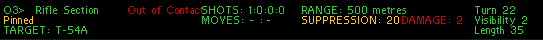 Additional new status information is now shown at the bottom of the screen. If the status is pinned, the status line is yellow, if retreat or worse, it is red. If suppressed more than 1, that is highlighted in yellow and Damage is now shown. In green if 0, otherwise in red.