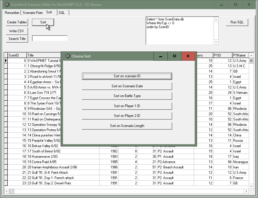 You will also see a RUN SQL button. That allows players to further refine their search using the data headers. For example the default for search title is ORDER BY Scenid and the list will be produced in scenario ID order but if you wanted to create the list by year you would change "ORDER BY Scenid" to ORDER BY syear and the list would show scenarios by the year they are representing