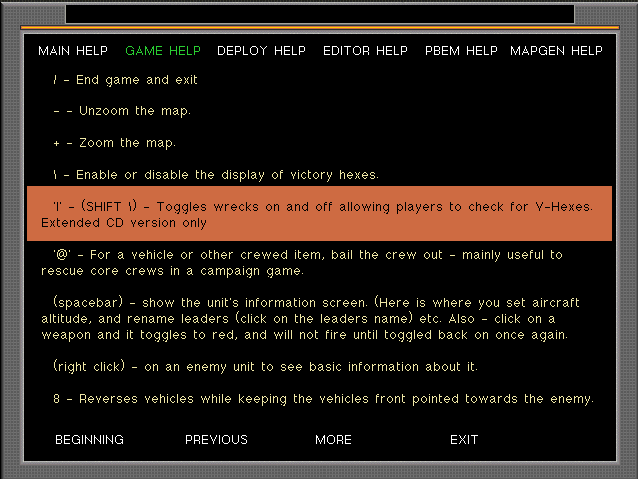 The display of wrecks In the game map can now be toggled on and off as with Victory Hexes in order to allow a less cluttered view of the map if needed. The “|” key (above the “\” key ( That is the Victory Hex toggle on/off shortcut on a US/UK keyboard) is assigned to the function.