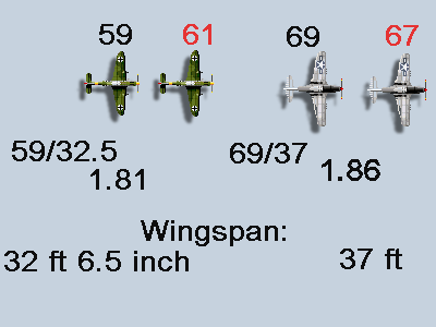 The wingspan of a 109 is less than a P-51. The P-51's in the game have a wingspan of 69 pixels the 109 is 59 pixels. I try to keep to odd numbers as a general concept as creating a balanced fuselage is easier when it's an odd number and since wings are in almost all cases the same the icons tend to be odd-numbered wingspans. There is a slight difference in ratio between the two....1.81 vs 1.86.