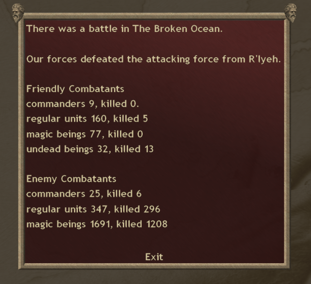 We're talking about a few hundred mind blasters... Aboleths, Mind Lords, gibodai, giboleths, with a fronting army of several hundred chaff. Atlantis has some very good evokers, but that does me little good underwater. I tried using Anti-Magic on my whole army, but they were still slaughtered.