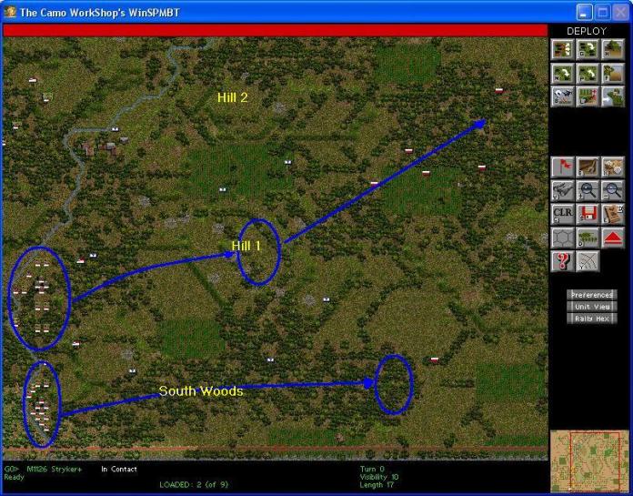 The reserve will be thin. I will only have the tank company HQ and one platoon. They will be positioned to the south where they could support the either the infantry on the hill or in the woods. If nothing of consequence develops in those areas, they will move up to Hill 1 and with the infantry and the other tank platoon, try to push to the northeast and capture the objectives there.