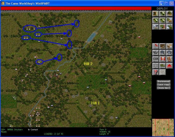 Terrain: Map = 100x100. Moderately wooded terrain with 33% of the map having trees and the other 67% composed of clear area, fields and tall grass. The wooded areas are composed of some large clusters and some tree lines. There are a lot of small to moderate sized hills all over the map but none really dominate the terrain and aren’t high enough to allow vision over the trees. There is one stream that extends across the map on the north-south axis. It starts in the top middle of the map extending to the southwest until it reaches my deployment line before turning south, meandering back and forth across my deployment line. There is one East-West road one 50 meters north of the bottom edge of the map. Visibility = 10.