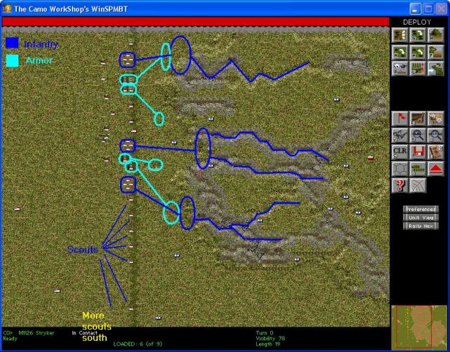 The first part of my plan is to move in close to the plateau for protection. Almost all of my units will move forward to the western slopes. As quickly as possible, I need to get eyes on top of the plateau. It's very difficult to stop attacks I don't see coming. My UAV will come into play here. It will make a quick run along my LD after the AI first move. With high visibility, anything the enemy has moved, I should see it and maybe some stuff that doesn't. Even if I lose the UAV and I probably will, the intel I get should be priceless.
