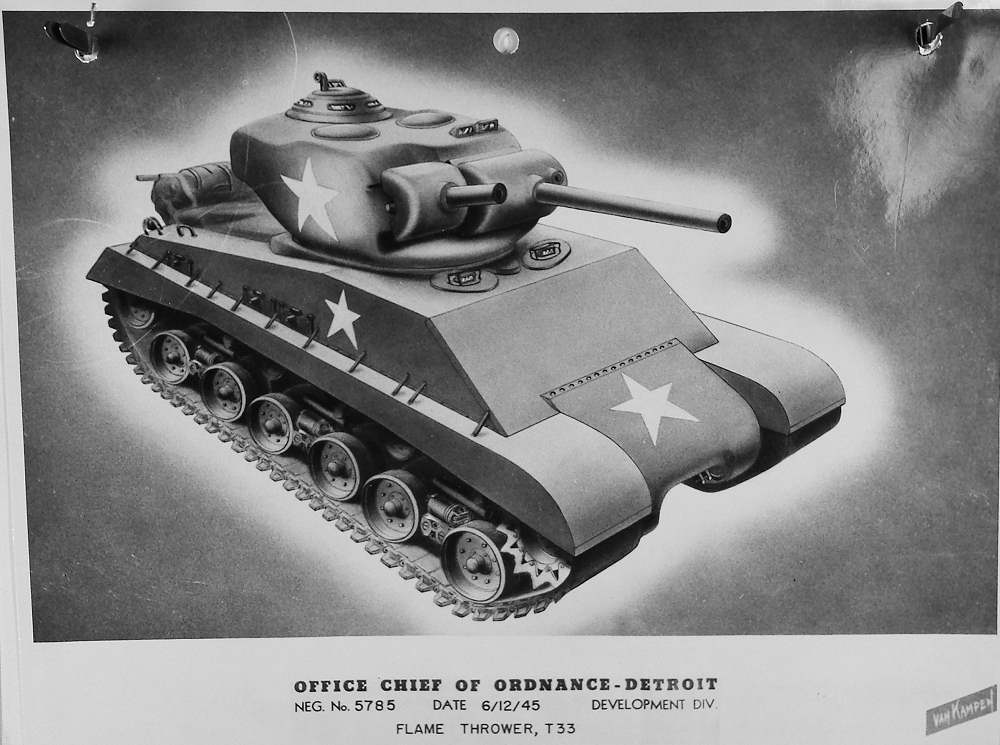 T33 Flamethrower tank. 600 were going to be built from I don't know, very late 1945 to 1946. But with VJ day, the order was killed.