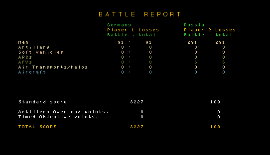 It was all over after 20 turns. Score was Germans 2964, Sovs 81. Didn't score many kills but about half the enemy fled in terror. Here are 3 saves (from setup, turn 7 and 20); hope there's no problems with winzip or whatever (they came from slots 10-12; not sure how to change them):