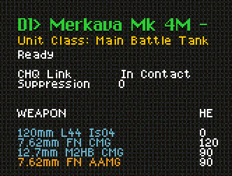 Update: Now one immobilized Merkava IS firing, least at close range (400 meters in this case). Funny 'cuz the unit info gives both CMG and AAMG the same range (2400 meters IIRC). [Edit: Then it stopped firing again, dunno why--hasn't taken any more casualties]. Also, looking at a previous save there was one tank that fired once (it was down to 89 firing opportunities out of 90). Weird, no?