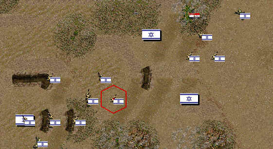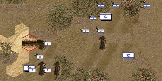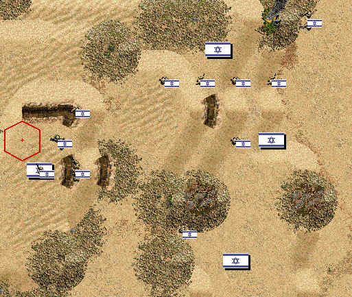 I begin the battle by moving my two separate forces of Israeli commandos together to the south. It is there I will initiate my attack. It is dark and visibility is limited to a litte over 100 yards (3 hexes).