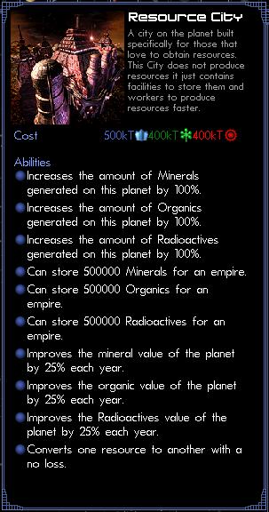 Cities- Have you ever wanted to build huge cities on your planet? Well now you can. In this mod there will be five types of cities, each providing huge benefits to those that have taken the time to build them. Cities have long build times(on average 10 years) and high resource cost, but have huge benefits. Cities are specialized to provide only advantages in their specific area, ei Intelligence cities provide a huge increase in intelligence generation. The only limit to city construction is the facility limit for the planet. You can have an entire planet that is nothing but cities if you wanted to. The cities portion of this mod has been completed, and all five cities have been beta tested and work well.