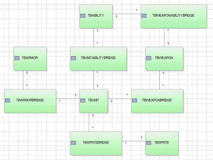 well, here's how i would lay out the db. common stats, those that all units, armor or weapons have in common, would be in thier respective tables (tbUnit, tbArmor, tbWeapon) though uncommon abilities, such as flaming or poison, would be in tbAbility and linked to through the various ability bridge tables. ultimately, each unit is linked to weapons, armor, sprites and miscellaneous abilities through various bridges so that units which have similar abilities need not have duplicate records of that ability, thus saving a lot of space.