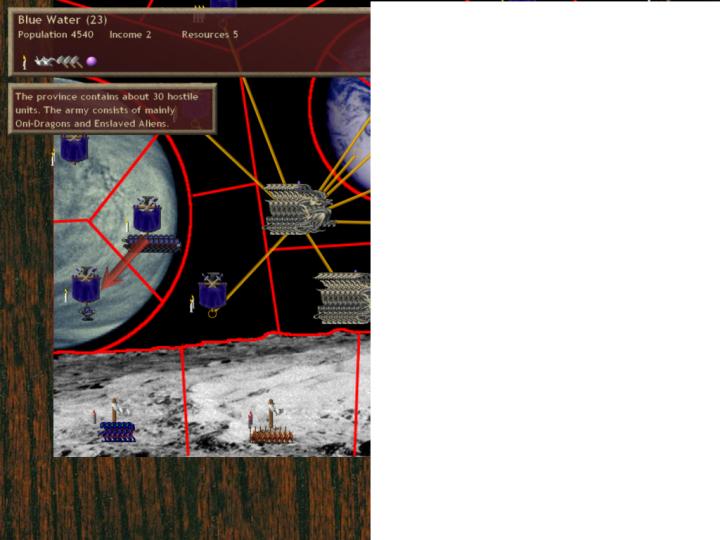 The following provinces have Oni Dragon PD in one or both games: 13 (oni dragons and space trolls in one game, blue aliens and space trolls in the other), 22 (oni dragons, thralls, vampires, space pirates, space station, vampire count), and 1 (heavy infantry, light infantry, crossbowman, space station). There could be more since I haven't explored the whole map in either. I saw a few provinces that had no independants as well, one of which I believe was that planet with every terrain type, connected to the center province of that large planet on the bottom. Also in my game as ulm it seems r'lyeh somehow managed to acquire upwards of 40 oni dragons, though I'm quite certain they don't have the spell to summon them. Screenshot attached, if not pretty.