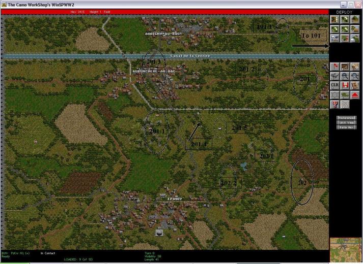 On the south end of the canal I will deploy a Panther platoon, with my company leaders (2 Panthers) as a flanking defense, and over watch to the land area north of the canal (see map 201). The other Panther platoon advanced right south of this hill, due west to the northern hill and victory objectives (see map 201/1). In support of this Panther platoon I have two Flammpanzer III, and two Moebelwagon-2cm. To the Northern trust I have 1 platoon of Sdkfz 251/1 Rak. These have limited range, so they have to follow the spearhead and go in positions when contact is made with enemy units.