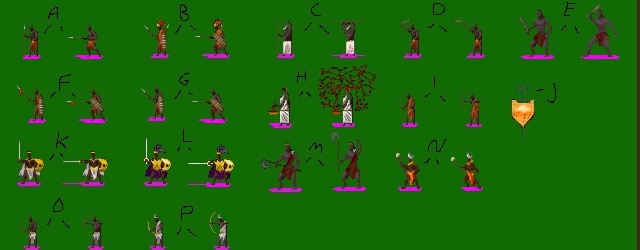 D = My general army, recuitable everywhere, I wasn't so sure about putting the caveman there, but I can work things like that out later, one new guy is the tribal leader commander, mostly taken from MA Machaka, but with orangey toga thing, and darker red feathers.