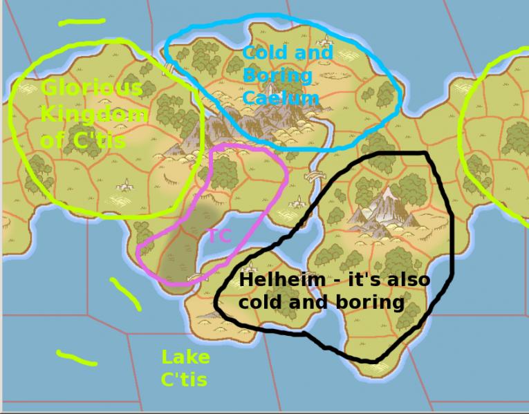 For lurkers, I'm attaching a rough map of the game state that doesn't give away too much information. Lake C'tis is so dubbed because I have an underwater fort there.