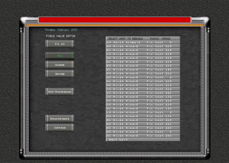 I've been mass deleting/rebuying units several times in a long campaign. After the last mission I went to the core repair screen and had ~9000 repair points left. I went to "expand core" and my available points went from ~9000 to -55820 and then to several million as I tried unsuccesfuly to buy more helicopters. After leaving the "expand core" screen I can't go back again, and I can't repair any of my troops either.