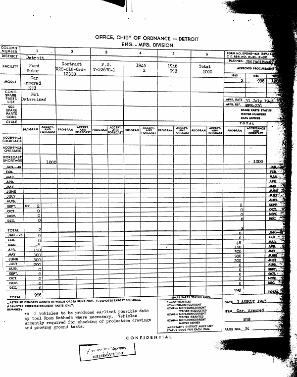 Designed by Chevrolet, but Ford was assigned mass production -- 1000 were to be produced, 2 in 1945 and 998 in 1946; broken down as (see attached for monthly figures).