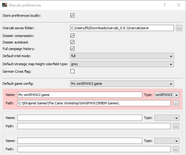 No, I wasn't thinking about using War Cabinet for PBEM. That just happened to be the last path I tried while trying to make it work. The instructions indicted to enter the game path. I assumed you meant the folder with the actual game file I wanted to work with: the Saved Games folder or the PBEM Games folder. You should have just said: "C:\...\WinSPWW2\" in the instructions.