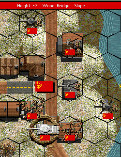 The Russian IS-2 (E1) starts dug in on a wooden bridge over nothing at hex 36,28.