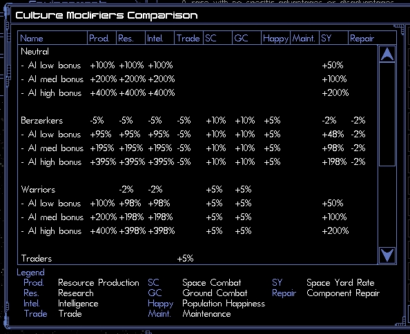 Then, if you wanted to give the A.I. a bonus to resource production and construction rate only, you can create additional cultures which have bonuses in those areas only and assign them to the A.I.s.